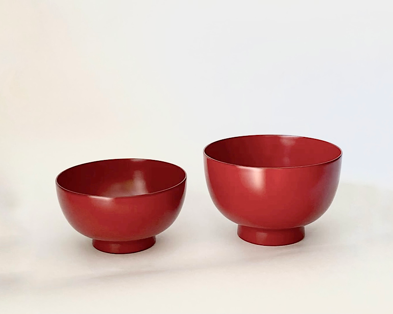 素地に木粉と樹脂を混ぜた木質樹脂を使用することで、熱(100度以下)に耐えられるように仕上げられた漆椀です。塗りには油分のない良質な天然の素黒目漆のみを使用しています。マットな質感の落ち着いた艶が特徴で、きめが細かく上品な印象です。木材の加工から塗り作業すべてを日本で行い、職人が一つ一つ丁寧に仕上げています。
