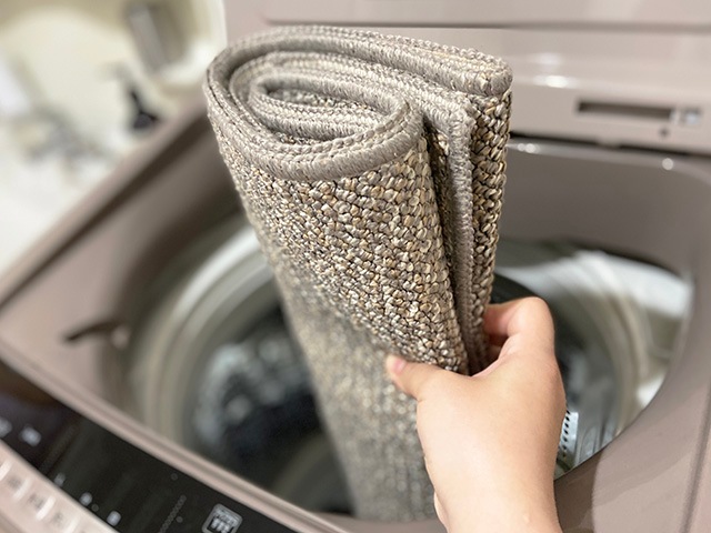 ※ 洗濯機での丸洗いは洗濯ネットをご使用ください。ドラム式等の一部の形式の洗濯機はご使用できない場合があります。(マットの重みによって洗濯機が止まったり、故障の原因になる恐れがあります。また、ドラム式洗濯機の特性上、少ない水でたたき洗いを行うため、パイルの抜け落ちやマットが歪む恐れがあります)洗濯機の取扱説明書をよくご確認の上、お洗濯を行ってください。