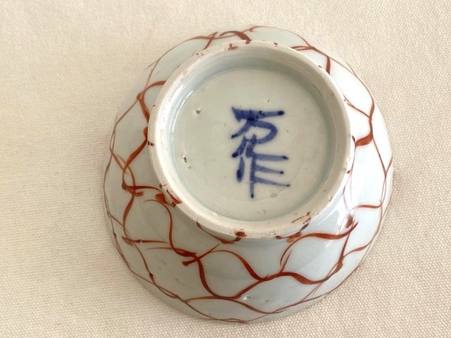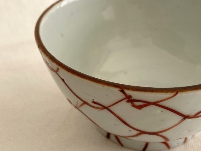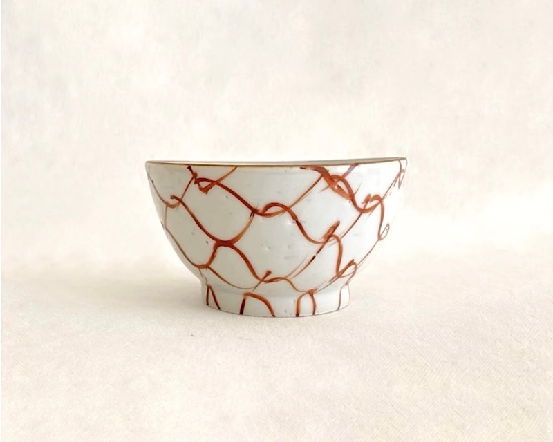 こちらは、落ち着いた赤のあみ文にぽってりとした丸みと厚みが手に程よいめし碗です。