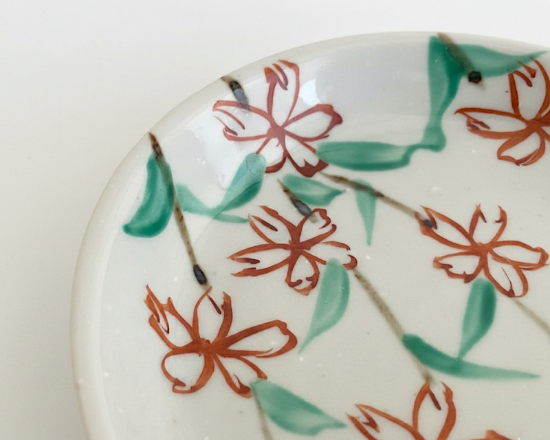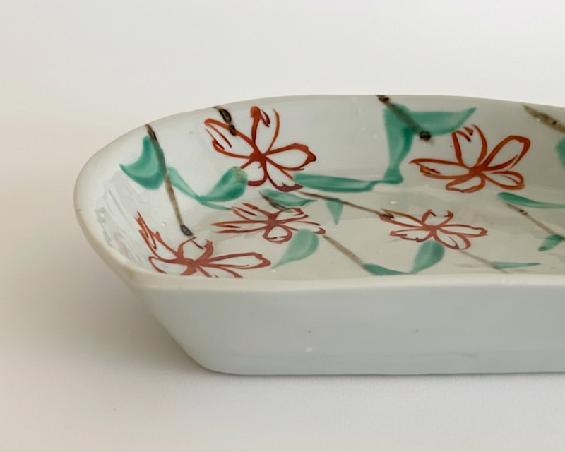 万作さんならではの、力強く勢いのある筆致で描かれたしだれ桜の半月皿。すっきりとした直線と、柔らかな曲線が同居する半月型は、丸皿が多い食卓に一つ加えるだけで、空間に奥行きと変化が生まれます。 余白を活かして少し贅沢に盛り付ければ、いつもの副菜もまるで料亭の一皿のような佇まいに。