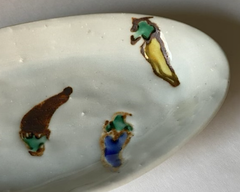 万作さんのうつわは、粘土に細かい砂利を混ぜ、手づくりの質感や味わいを表現しています。そのため、作品には鉄粉(茶色い点)やピンホールが見受けられます。万作さんの作風のひとつとしてお楽しみください。