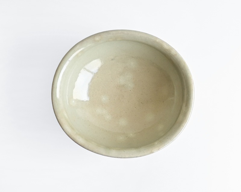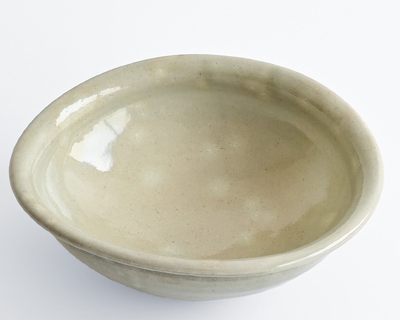 こちらは、「白化粧」と呼ばれる白い泥をかけて焼く「粉引」の技法を用いた楕円鉢です。