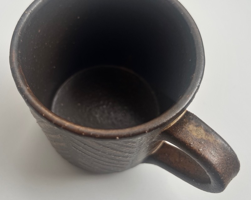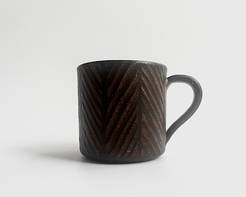 土を削り、削った箇所に違う色の土を埋め込む「象嵌(ぞうがん)」という技法によって紋様が施されたマグカップ。象嵌の技法によって表現される独特の温かさに加え、ヘリンボーンの紋様がモダンな雰囲気です。