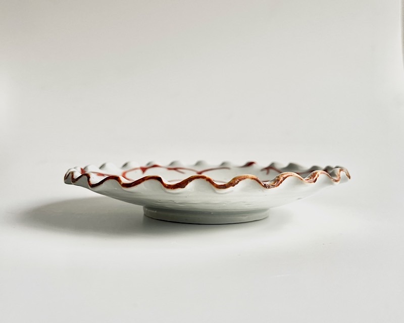 万作さんの真骨頂とも言える、伸びやかで愛らしい赤絵の花文。縁を花びらに見立てて削り出した「輪花」の形状が、影を作り出し、器の中に独特の奥行きとリズムを生み出しています。普段の煮物やお浸しも、この器に盛るだけでパッと明るい印象に。