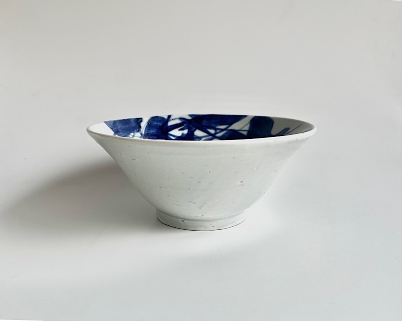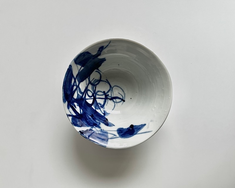 適度な深さがあるこちらの鉢は、汁気のある煮物から、ごろっとした旬の野菜、あるいは和え物まで、どんな料理も包み込む懐の深さがあります。白い磁肌と青い染付のコントラストが、料理の色彩をより鮮やかに引き立てます。