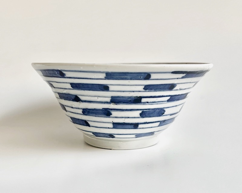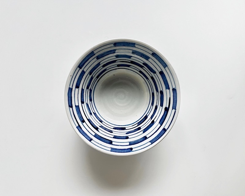 万作さんの描くつなぎ文は、手描きならではのゆらぎが、器にリズムと躍動感を与えています。呉須とやや青みがかった白磁のコントラストが、和食だけでなく洋食や中華とも相性がよく、多用途に使いやすい器です。